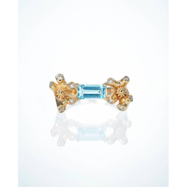 La claridad del agua llevada a forma. La aguamarina se integra en una estructura orgánica que evoca el movimiento suave de las aguas cristalinas. Una pieza donde transparencia, luz y volumen dialogan con suavidad. Materiales Oro de 18k y aguamarina natural de talla baguette enmarcada por...