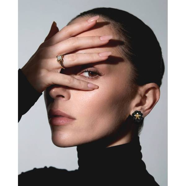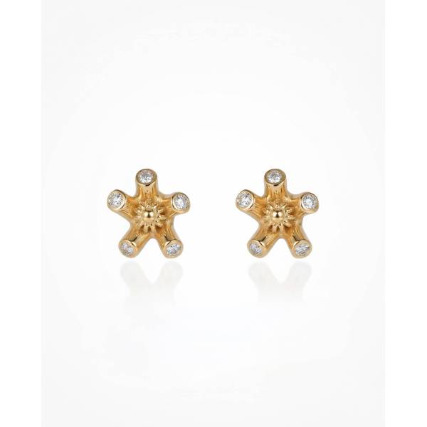 Una flor en equilibrio. Cinco puntos donde la luz se posa en torno a su centro, trazando una forma precisa y silenciosa. Entre geometría y naturaleza.   Materiales Oro amarillo de 18k y diamantes naturales de 0.015 ct de talla brillante.Diamantes seleccionados con un mínimo de color de G+ y una...