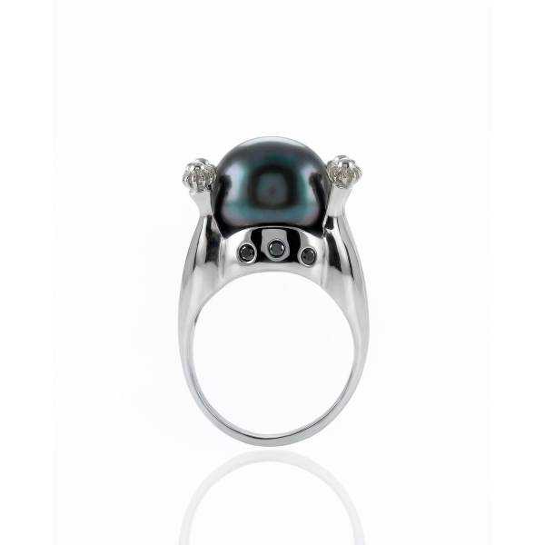 Una forma contenida y poderosa. La perla negra emerge como un núcleo denso y silencioso, sostenida por una arquitectura de oro que la envuelve y la eleva.Una pieza de contraste: peso y delicadeza, sombra y luz. Materiales Oro blanco, perla negra natural y diamantes negros naturales de talla...