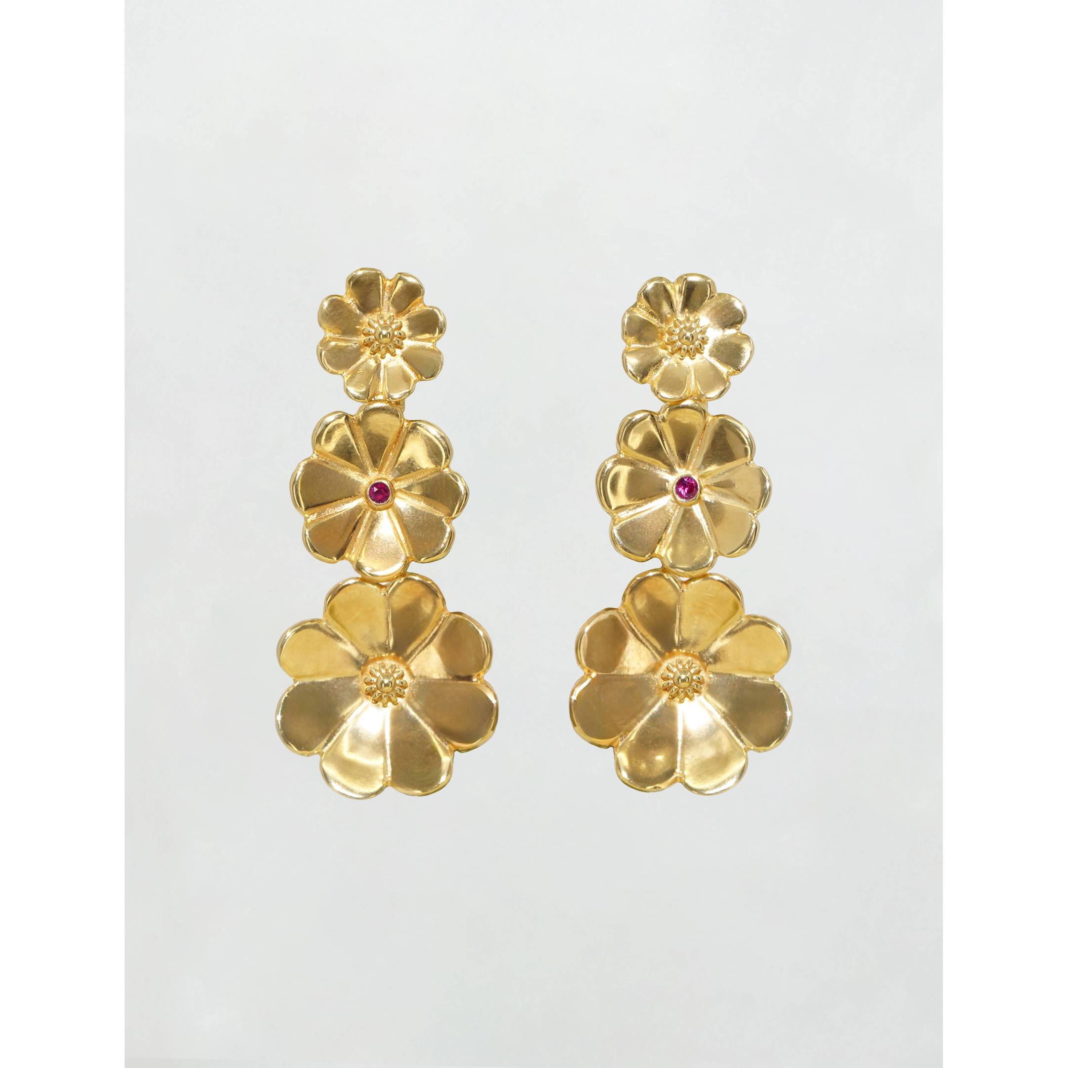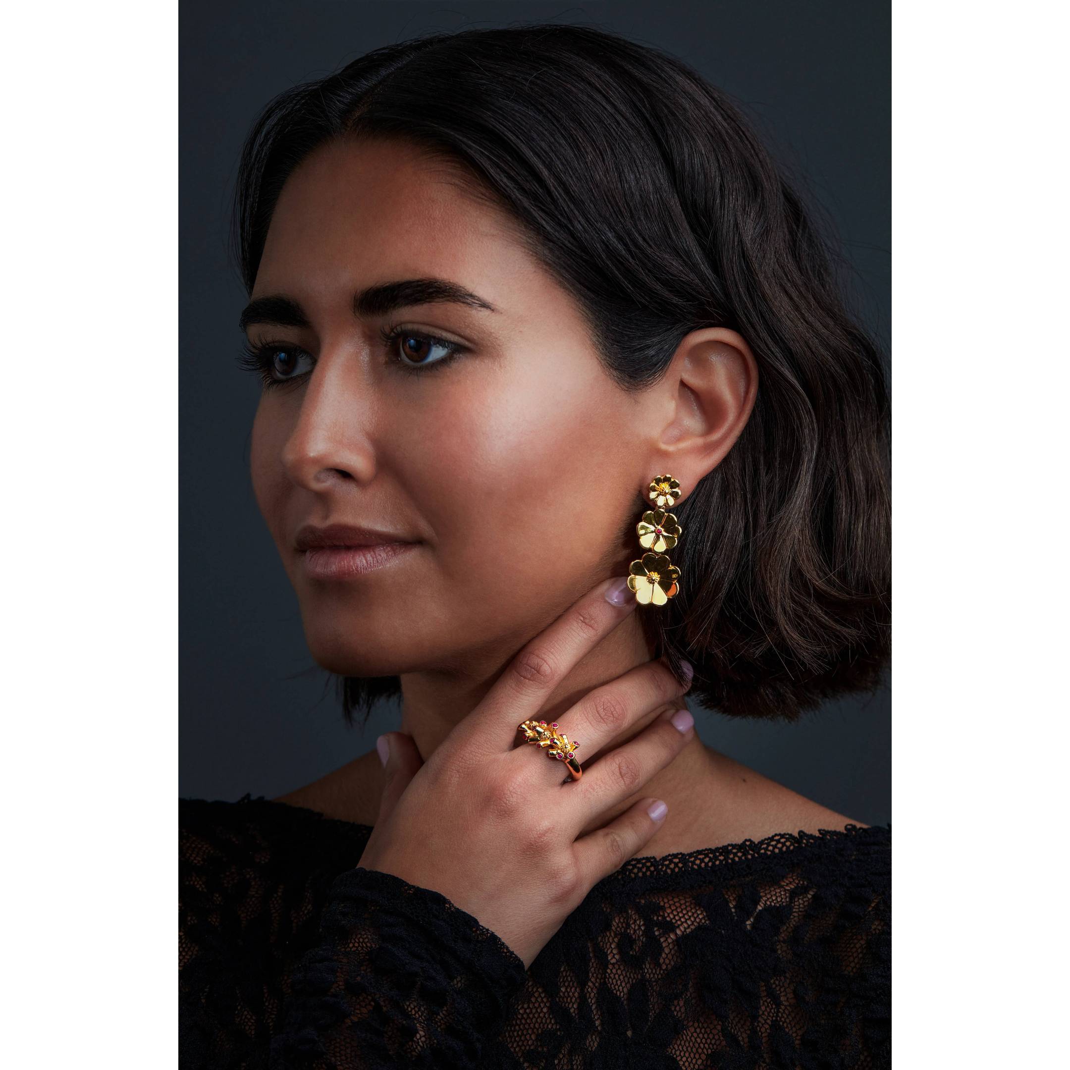 Mouchos, coruxas, sapos e bruxas… Los sapos, la pieza más importante de la joyería tradicional gallega, se reformulan para crear estos pendientes de inspiración floral a través de la flor ibicenca. ¡Imposible no sucumbir a su conjuro! Materiales Oro amarillo de 18k y rubí natural de talla...