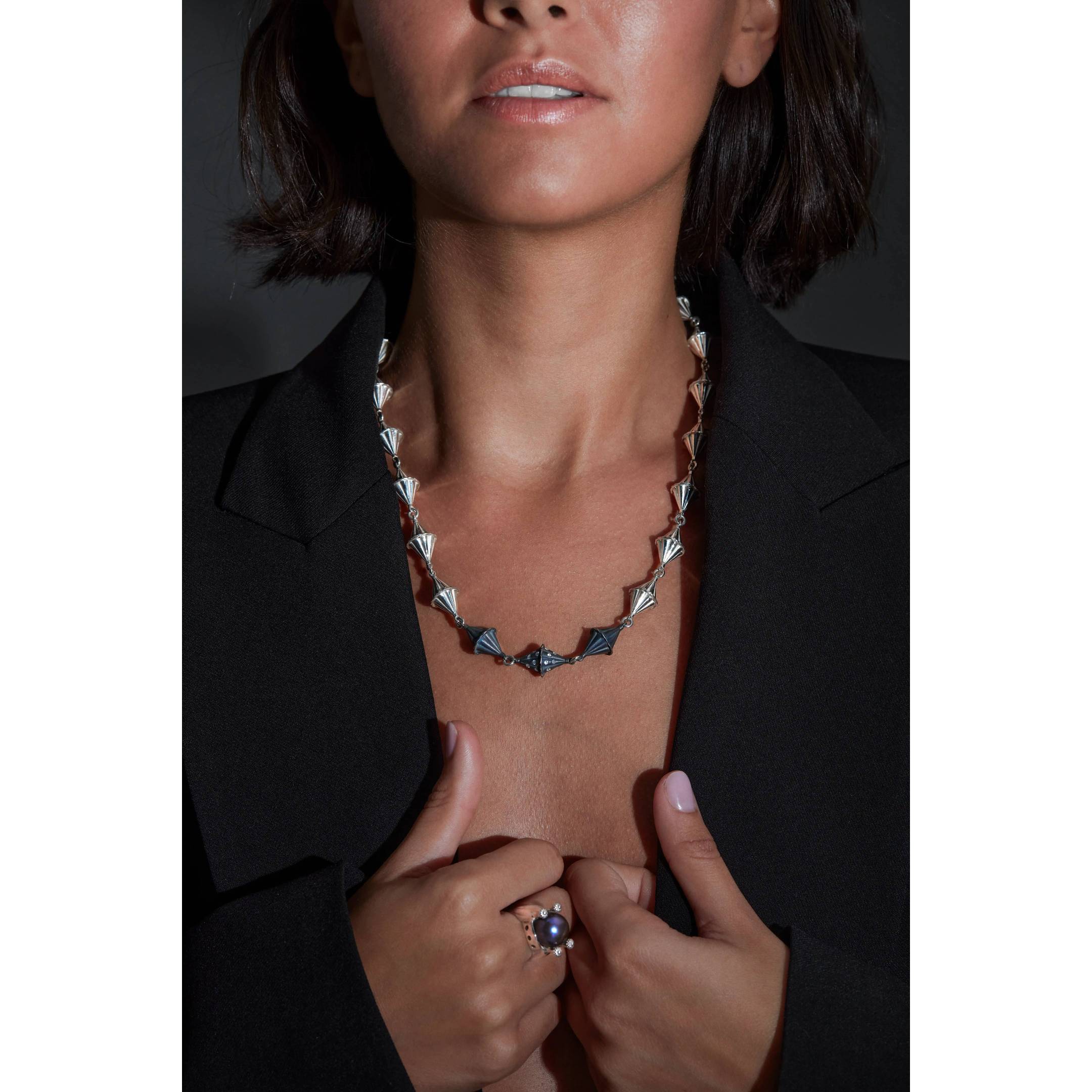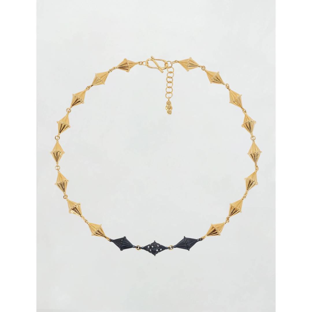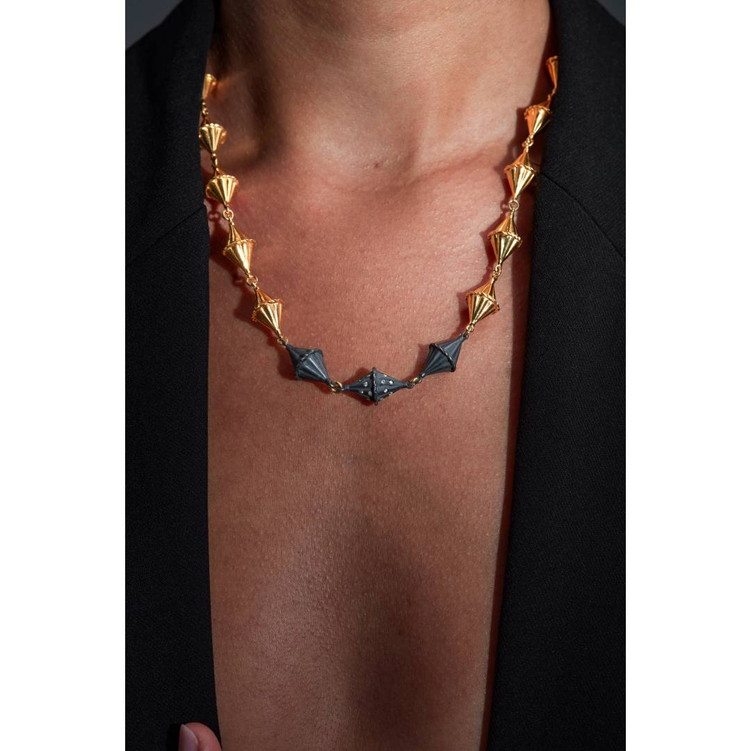 Mágico, ecléctico e inspirado en las cuentas de rombos o “gra d’ordi” del collaret de la emprendada ibicenca. El collar Nit fusiona tradición y vanguardia para crear una pieza tan original como sofisticada.