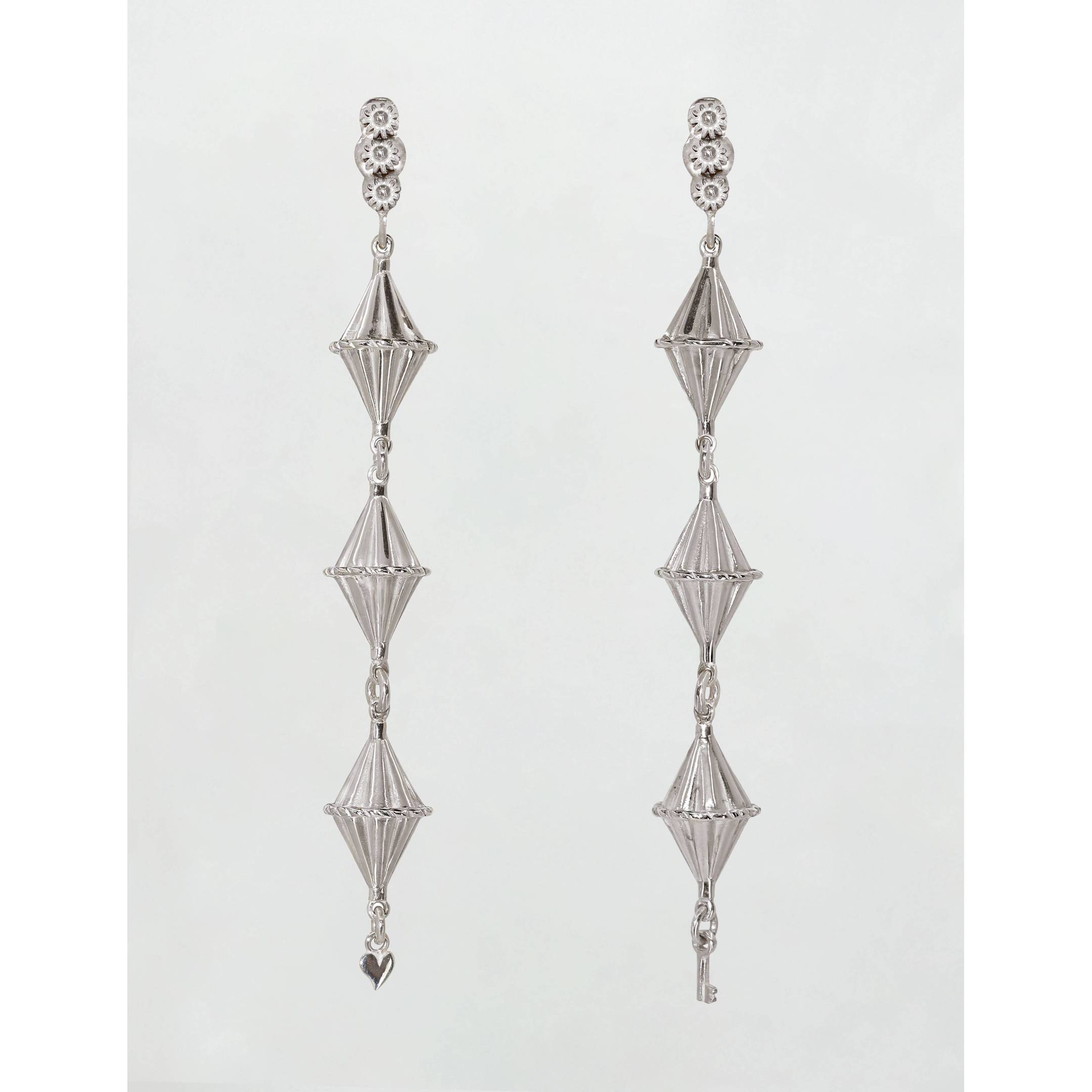 Étnicos, elegantes y con personalidad. Los pendientes Sarabia están inspirados en los rombos o “gra d’ordi” del collaret de la emprendada tradicional ibicenca. Materiales Oro blanco o plata 925. Longitud 8,75 cm