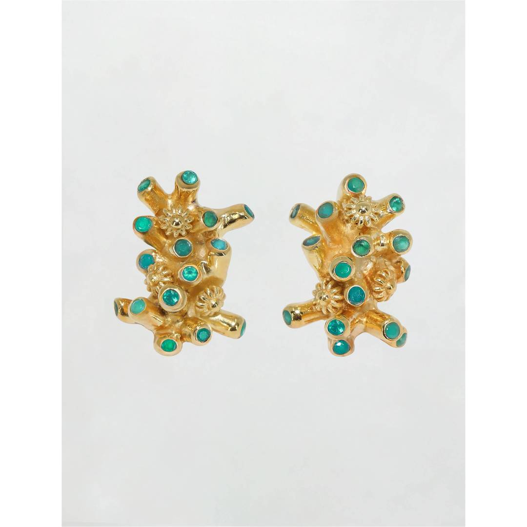 Pendientes macizos de oro amarillo de 18k y treinta esmeraldas naturales de talla brillante.