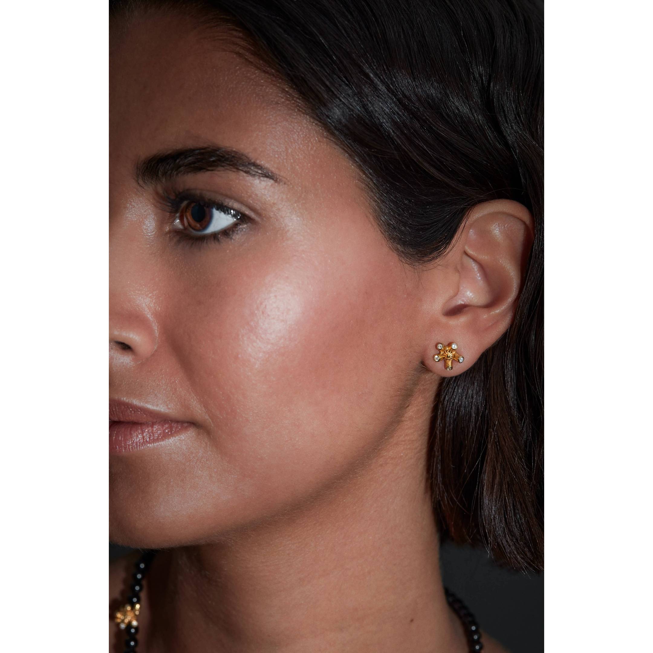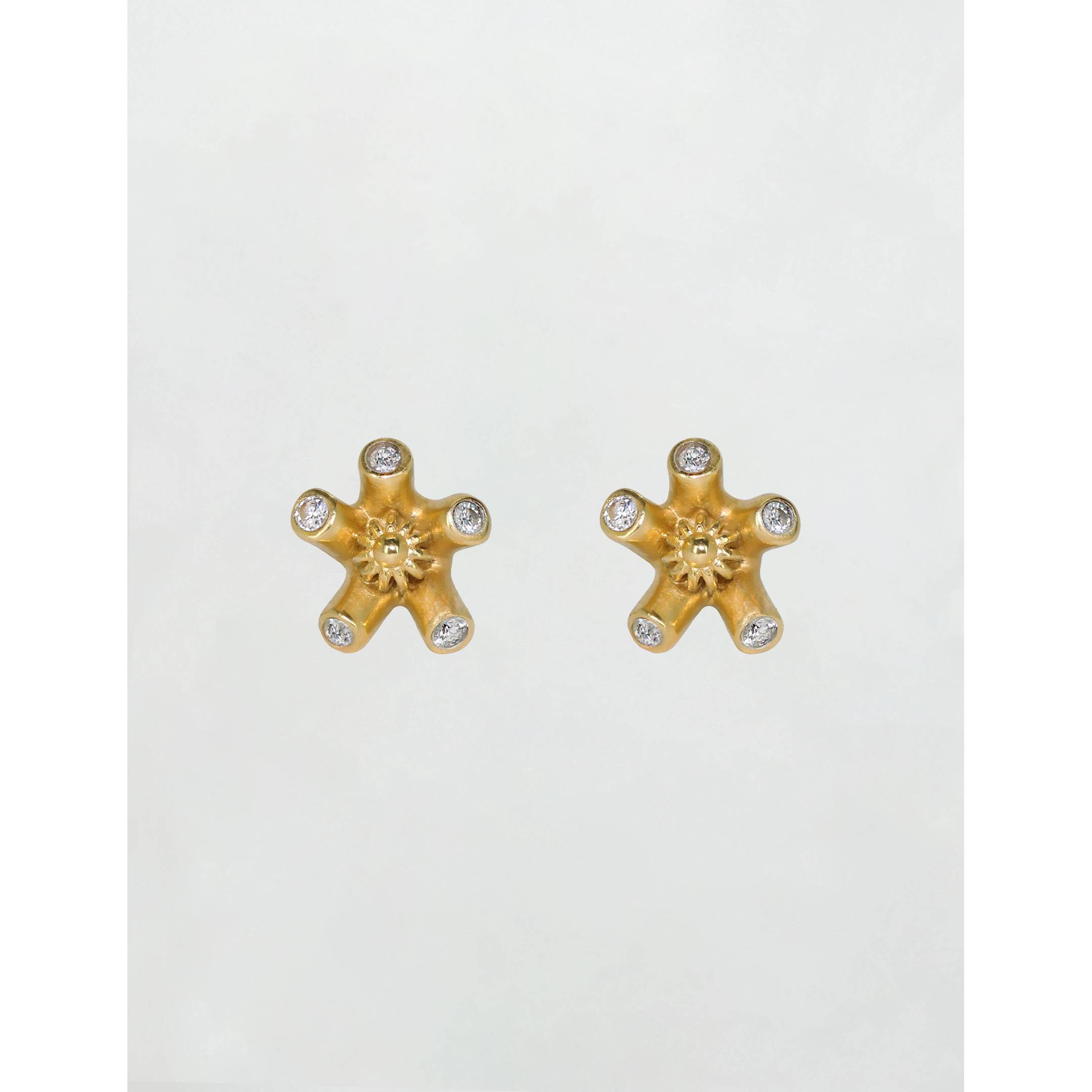 Studs de cinco puntas y roseta de filigrana en el centro.   Materiales Oro amarillo de 18k y diamantes naturales de 0.015 ct de talla brillante.Todos los diamantes utilizados son de excelente calidad, con un mínimo de color de G+ y una claridad de VS1. Tamaño1 centímetro.